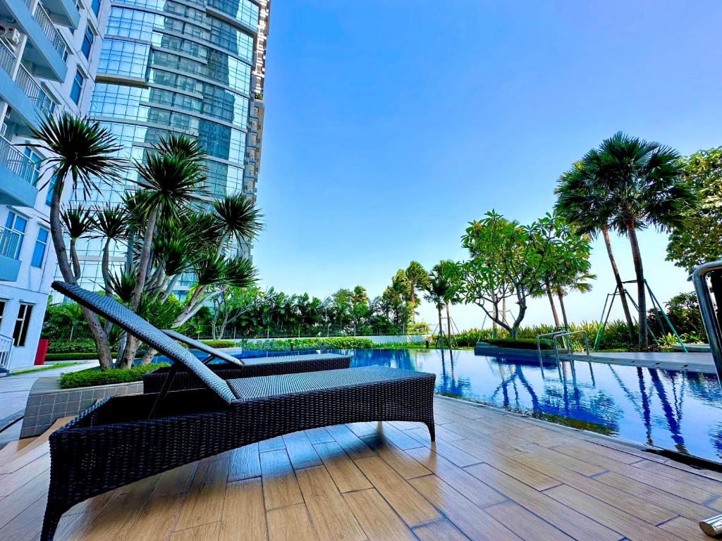 Apartemen ber-AC ini memiliki 2 kamar tidur, balkon dengan pemandangan kota, ruang tamu nyaman dengan TV layar datar, dapur lengkap, serta 1 kamar mandi modern dengan shower dan bidet.