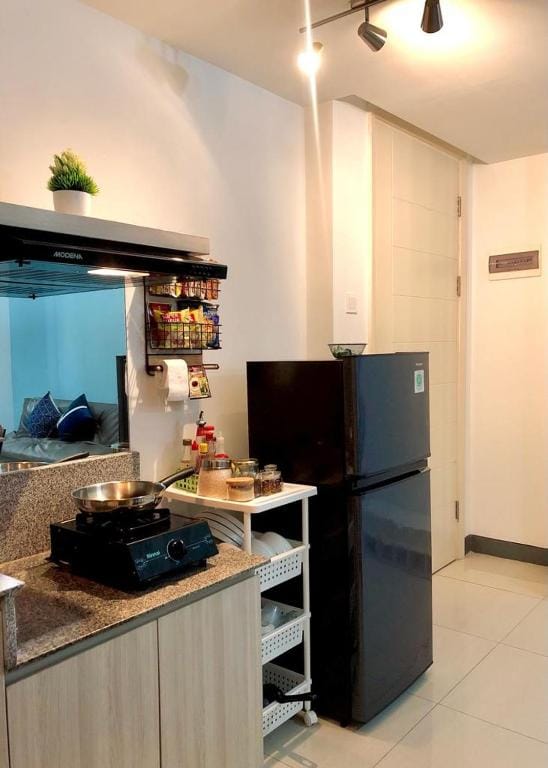 Enjoy a complete kitchen setup including refrigerator, stove, cookware, and full dining set (plates, glasses, cutlery) for comfortable home-style meals during your stay in West Surabaya.