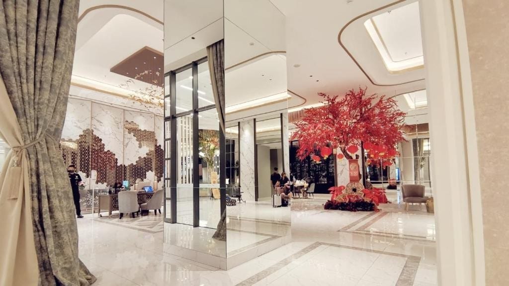 Elegant lobby seating area at Benson Tower Surabaya, featuring marble floors, modern décor, and a refined ambiance in West Surabaya.